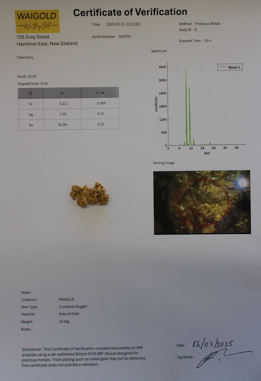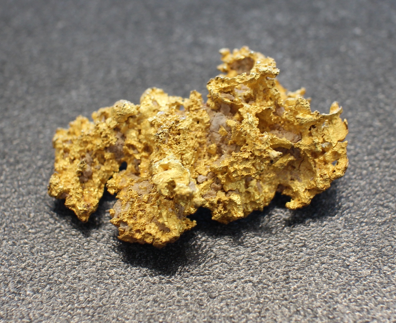This particular nugget is an excellent example of this type of crystalline gold. It is 91.84% gold making it 22kt. See the attached XRF analysis for more details on the chemistry of this piece.