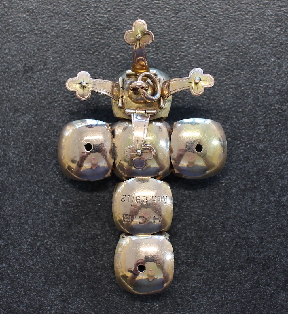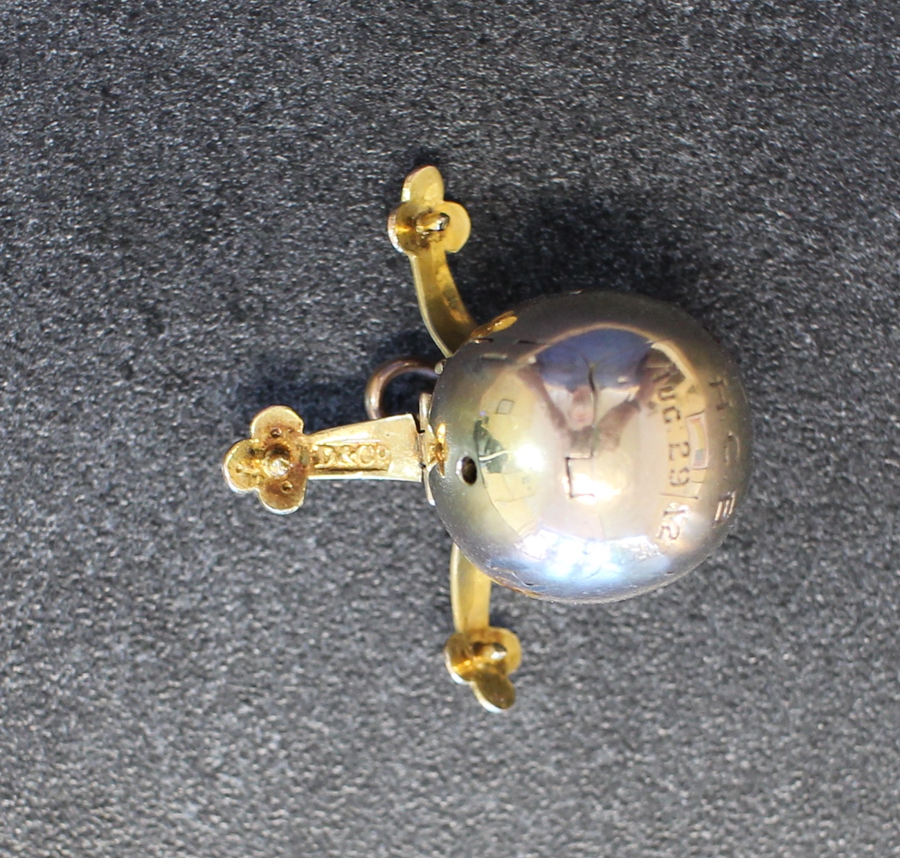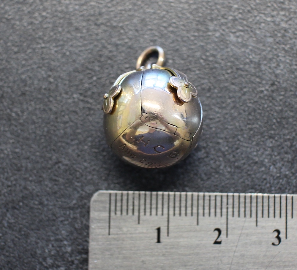 Above is the brief history of Harold Barlow. The item for sale is the Masonic Ball pendant/fob that belonged to Harold Barlow. It tells us a little more about the man. When he got this pendant in 1912 he was 21 years old and clearly a cricket lover! The engravings on the gilded silver pyramids of this ball are not typical of masonic jewellery – they are indeed a cricket bat, ball and two sets of wickets. The pendant is also engraved on the 9kt gold surface with “H. C. B. Aug 29/12”. This piece, along with two others were sold to us by the descendants of Carver’s brother, to whom the inheritance went after their father’s death.