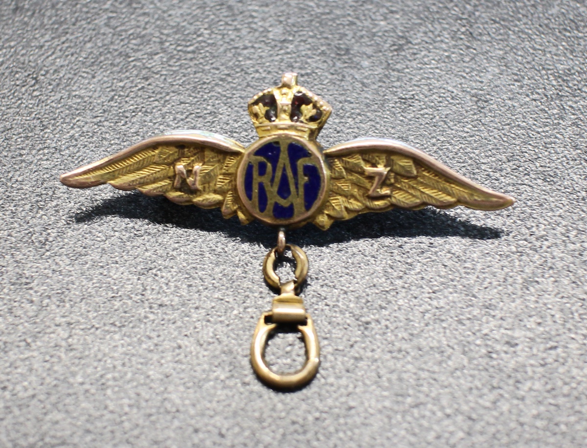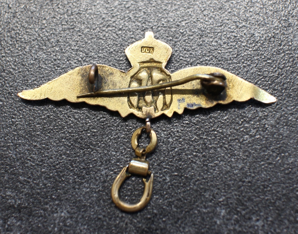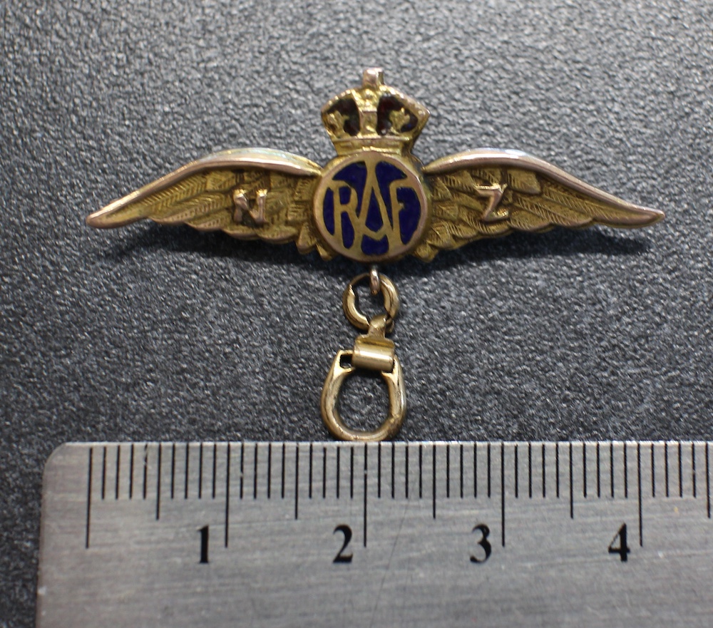 I haven’t seen one quite like this before. It’s a World War 2 period 9kt gold sweethearts brooch in the style of the RAF Flying Badge with N and Z on each wing. The links below the badge are plated gold, but the badge itself is marked and tested as solid 9 kt (.375).